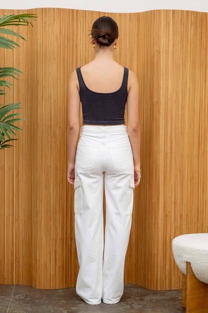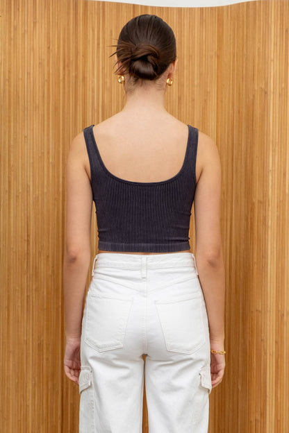 V neck Rib knit Sleeveless Scoop back Cropped Solid Tank Top
