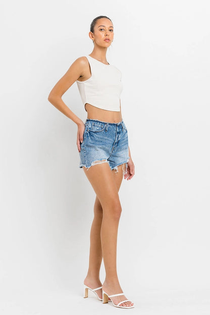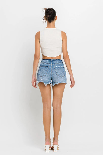 High Rise Distressed Shorts by Flying Monkey, Non-Stretch Denim, High Waist, Distressed Detail, Button Fly,