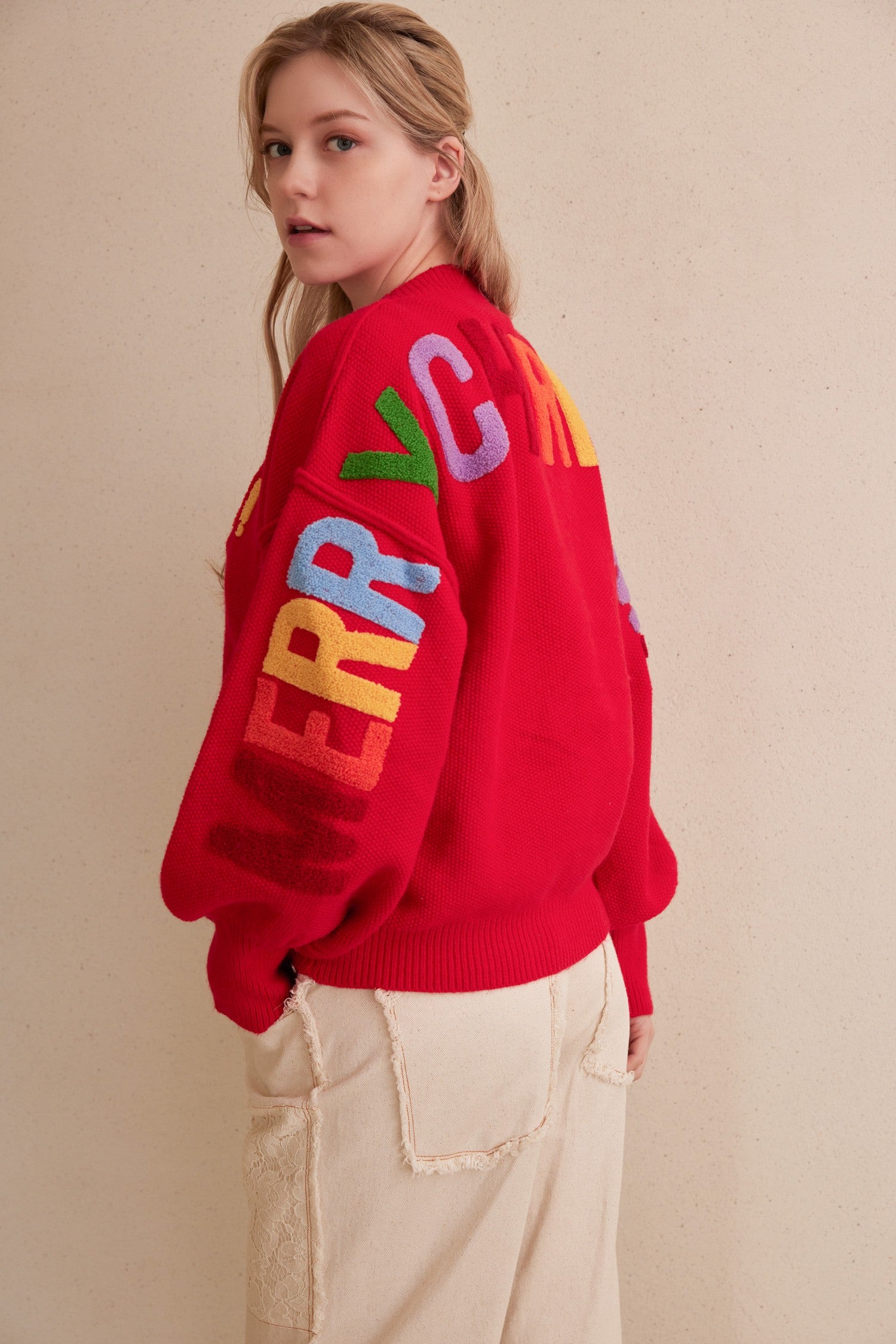Oversized Christmas Sweater in Red w/ Giant Rainbow Letters