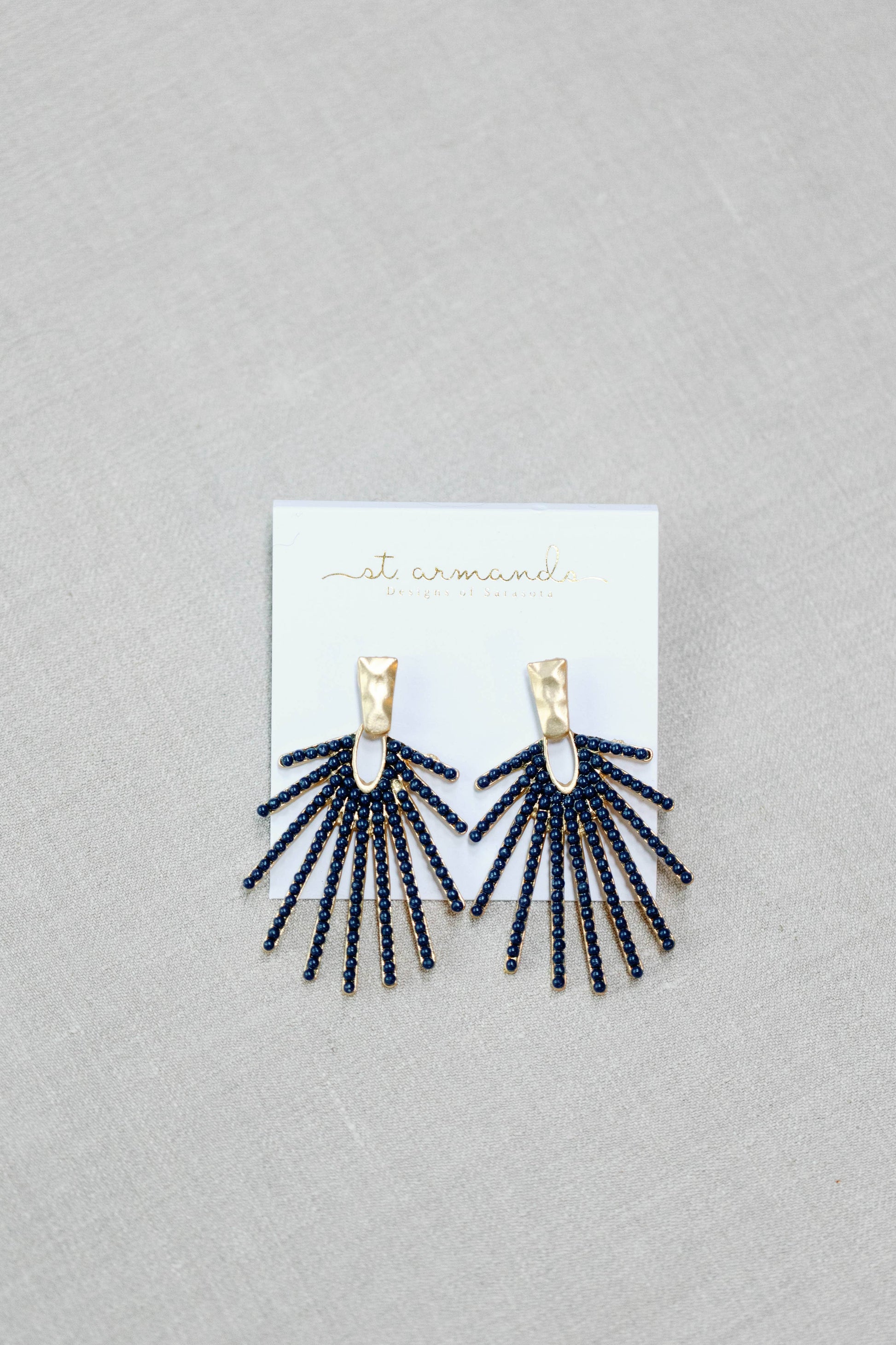 We love a good sunburst design! These navy and gold drops are the perfect statement piece, and look great with so many outfits! - 1 inch wide, approximately 2 inches long - post back - navy beads - hammered gold upper piece.